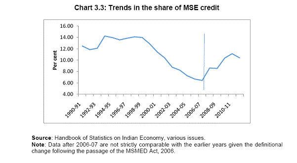 Governments in many countries could not scale down or discontinue the DLPs in order to avoid further misuse of these programmes given the pressures exerted by a given constituency that benefitted from these programmes.7 However, there were also cases where the government discontinued these programmes, particularly the longstanding ones, leading to a serious contraction in credit availability, growth and employment.8 3.8 In sum, the available evidence on DLPs from various countries suggests positive social and economic outcomes from these programmes. In certain cases, however, it raised concerns about the benefits from these programmes, not reaching the targeted sections and resulting in financial stress for the lenders. | Table 3.1: Existing DLPs in select advanced and emerging economies | | Country | Sectors/activities under focus | Implementing agency | | US | Small businesses, students/education, Low income groups in rural areas/for creation of electricity, waste disposal facilities Low income groups, elderly and handicapped/housing (involves credit guarantee in lending to some of these sectors) | US Government Departments (either independently, or in collaboration with private investment companies) | | EU (Denmark and Ireland)9 | Micro enterprises, Small and Medium Enterprises (involves sectoral targets, credit guarantee) | Private banking institutions | | Brazil | Industry including SME sector/long-term investment credit, Rural housing, Agriculture, Micro credit (involves credit guarantee, interest subsidy and sectoral targets for some of these sectors) | Public banking institutions (either directly or through local commercial banks) | | People’s Republic of China | Agriculture, Micro and Small Enterprises (involves sectoral growth targets, credit guarantee, interest rate subsidy) | Public banking institutions | | Pakistan | Agriculture, Exports (involves indicative targets and interest rate subsidy) | Public and private banking institutions | | Russian Federation | Agriculture and agro-based industries, Rural infrastructure (involves interest subsidies) | Public banking institutions | | Philippines | Agriculture (involves credit guarantee) | Public and private banking institutions/cooperatives | | India | Agriculture, Micro and small enterprises, Education, Housing, Socio-economically weaker sections (involves aggregate targets and sectoral targets for some sectors, credit guarantees and interest subsidy for some sectors) | Public and private banking institutions | | Source: Circulars at <www.va.gov>, <www.sba.gov>, <www.bndes.gov.br>, China Banking Regulatory Commission – Annual Report 2011, <www.sbp.org.pk>, <www.oecd.org>, <www.rbi.org.in>. | II. Priority Sector Programme in India: An Analysis 3.9 There is a large body of literature examining the impact of financial intermediation on economic growth. Empirical findings broadly support the view that financial development has strong influence on economic growth and financial market imperfections have an impact on investment and growth.10 However, despite being one of the largest and longest public policy intervention programmes in the world, empirical evidence of the efficacy of PSL meeting its final objectives has been limited. It turns out to be a relatively tricky issue, and even referred to as “a gaping hole in the entrepreneurship development literature”.11 3.10 In the case of agriculture credit, when the farmer faces a credit constraint, additional credit supply can raise input use, investment, and hence output. This is the liquidity effect of credit. But credit has another important role. In most developing countries where agriculture still remains a risky activity, better credit facilities can help farmers smooth out consumption and, therefore, increase the willingness of risk-averse farmers to take risks and make agricultural investments. This is the consumption smoothing effect of credit. 3.11 In the case of India, early evidence based on detailed district level data suggest that in agriculture, the output effect of expanded rural finance is not large, despite the fact that credit to agriculture has strongly increased fertilizer use and private investment in machines and livestock. This means that the additional capital investment has been more important in substituting for agricultural labour than in increasing crop output. However, the impact of rural credit and the expansion of the rural financial system on rural wages have been positive, as the creation of non-farm employment has added more to total employment than has apparently been subtracted by the substitution of capital for labour in agriculture.12 Relatively recent evidence suggests that directed lending may have a consumption smoothing effect. However, evidence also suggests that it has contributed towards increased consumption inequality in rural India.13 3.12 Taking a sectoral approach, the Working Group attempted the quantification of the impact of PSL to agriculture and observed positive elasticity of credit to output based on district-level data for four States viz., Maharashtra, Andhra Pradesh, West Bengal and Punjab for the period 2004 to 2009.14 These findings broadly match with those in the literature that bring out a positive role played by agricultural credit in supporting the purchase of inputs and aiding growth in the agricultural sector.15 3.13 Further analysis based on the total credit to agriculture, and then separately for direct and indirect credit to agriculture suggests that the intervention through direct agriculture credit has a positive impact on agriculture output. This effect, however, was not statistically significant for indirect credit reflecting its limited role.16 Finally, the Working Group also examined how changes in growth of agricultural credit affected the growth of gross value added from agriculture based on a SVAR framework.17 The estimated impulse response showed that the increase in growth of agriculture credit p
