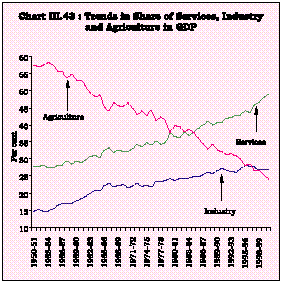 IV. SERVICES IN THE INDIAN GROWTH PROCESS 3.92 The phenomenal expansion of services world-wide led to services being regarded as an engine of the growth and even as a necessary concomitant of economic growth. In development economics, seminal works on phases of growth (Fisher, 1935; Clark, 1940; Rostow, 1960; Kuznets, 1971) suggest that development is a three-stage process. The dominance of the services sector in the growth process is usually associated with the third stage of growth. In this context, the ascendancy of services even in developing countries has been regarded as a mutation of growth. During the 1980s and 1990s, services accounted for a share of close to or above 70 per cent of GDP in industrialised countries and about 50 per cent in developing countries. In India, services accounted for 38.6 per cent of the GDP in the 1980s and 44.3 per cent in the 1990s. The Stylised Evidence 3.93 The growth of services sector has imparted resilience to the economy, particularly in times of adverse agricultural shocks as also during cyclical downturns in industry. The share of services sector has been steadily increasing, with a fairly rapid growth in the 1990s (Table 3.29 and Chart III.43).
