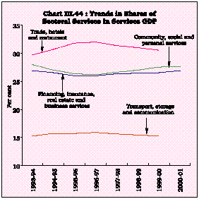 3.94 The weighted contribution of the services sector to GDP growth has been rising since the 1960s except during the 1980s when industry and agriculture recorded substantial acceleration, which led to erosion in their contribution to GDP growth. However, a resurgence of services in the 1990s with a growth of 7.6 per cent enabled services sector to contribute 57.6 per cent to GDP growth. 3.95 A notable feature of the structural transformation of the services sector has been the growth of skill intensive and high value added sectors, i.e., software, communication and financial services. The rapid growth of services can be attributed, inter alia, to the advent of information technology (IT) and the knowledge economy. This has enhanced the growth of the high productivity segment of the services sector as well as a variety of service activities involving low productivity activities catering to a large mass of people. The phenomenal growth of low skilled service activities has occurred due to reduced opportunities in the manufacturing sector, particularly in the unorganised sectors. 3.96 Trade, hotels, restaurants and transport and communication are the major segments in terms of their share within the services sector; however, their share in the value added in the services sector has remained constant at around 49 per cent during the 1970s and 1980s, before marginally declining in 1990s. The share of finance, insurance, real estate and business services witnessed significant improvement during the 1990s on account of the rapid pace of financial development (Chart III.44 and Table 3.30). The buoyancy in the services sector output is concentrated in the new economy sectors such as computer software and financial and business services. In the national income accounts, the contribution of the software industry in the real GDP is estimated at 0.78 per cent in 1999-2000. If raw materials in this sector are accounted for, contribution of the software sector (net of inputs) to GDP stands at about 1 per cent as per the estimates of the NASSCOM and the CMIE.