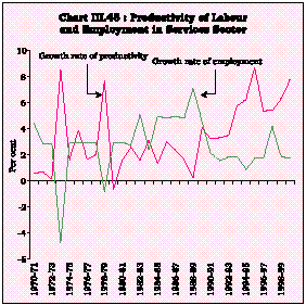 3. 104 The results show that hypothesis (i) can be rejected, i.e., growth rates of employment and value added in services sector are statistically different from each other during 1970-71 to 1999 -2000. As the mean difference is negative, the value added growth in services sector is, on an average, higher than employment growth in services sector, which confirms the finding of other studies that services sector has undergone a less than proportionate increase in employment in relation to output (Mitra, 1988; Bhattacharya and Mitra, 1990). The second hypothesis about the differences in productivity and employment growth in services has been tested decade-wise. Growth in services productivity for the whole period of 1970-2000 is observed to be higher but not statistically significant. The growth rate of productivity in services sector has been higher during the 1990s as the mean difference is found to be positive and statistically significant. Thus, unlike many other countries, growth of average productivity of labour in India has remained higher than employment growth in services sector during the post-reform period. The empirical findings are supported by the declining capital-output ratio in the services sector which can be interpreted as efficient use of capital by skilled labour and low contribution of services to total employment in contrast to its high contribution to overall GDP. This points towards a growth in total factor productivity in services (Chart III.45).