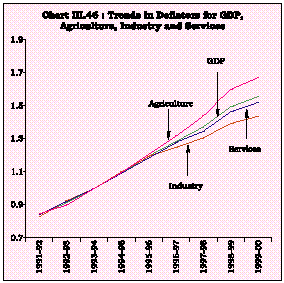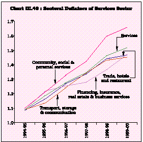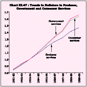 3.107 Within the services sector, the terms-of-trade have remained in favour of government services, closely followed by consumer services. The gap in the deflators between producer services, on the one hand, and consumer and government services on the other, has been widening since 1993-94. This is possibly due to the fact that for government services, which include public administration and defence, the behaviour of the deflator depends largely on government policies. The recent pay hike following the fifth pay commission's recommendation might have contributed to a relatively high deflator (Chart III.47).