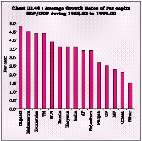 3.117 The regional growth experience of the 1990s suggests that States pursuing reforms seemed to have experienced higher growth rates in recent years with some tendency towards convergence. At the same time, the regional growth experience is indicative of some kind of unbalanced and divergent growth (Box III.5). Regional Dimension of Select Infrastructural Indicators 3.118 The convergence literature in India highlights the role of infrastructure-related facilities in fostering growth. A critical determinant of the divergence in growth profiles among regions is the inter-state differences in infrastructural facilities. Two select indicators of infrastructural conditions, i.e., electricity and transport are examined below. Box III.5 Convergence of Economic Growth One of the basic predictions of neo-classical or endogenous growth theory is that economies with lower capital per person tend to grow faster in per capita terms. Thus, there will be convergence of growth rates. The notion of convergence has attracted recent attention in the endogenous growth paradigm. It has been interpreted in two distinct senses. The hypothesis that poorer economies tend to grow faster than the richer ones is often referred to as the notion of absolute convergence. The empirical evidence in favour of absolute convergence from cross-country growth regressions has received mixed support. In fact, in some sample of countries the growth trajectories have been found to be quite independent of the initial conditions. This, however, could be due to the presence of heterogeneity in the sample of countries. It is in this context, the notion of conditional convergence has been proposed whereby an economy tends to grow faster, the further it is from its own steady-state value. In other words, each economy is conceived to be converging to its own steady state value, and the speed of convergence varies inversely to the distance from the steady state. How far are the predictions on convergence valid in the Indian regional set-up? There are divergent views in this regard. While a number of studies found out that the pattern of growth of per capita SDP has followed a divergent tendency in absolute terms, controlling for internal migration and centre-state grants, there is evidence in favour of convergence among Indian states. The speed of convergence has been, however, found to be quite low with estimate of the required time for a typical Indian state to close one-half of the gap between its initial per capita income and the steady-state per capita income at 45 years! What explains the pattern and extent of divergence among the growth profiles of Indian states, if any? Incorporation of omitted variables in the growth regression across Indian states has attracted attention in recent years. In the determination of regional steady-state level of income and ensuring conditional convergence, a number of variables have been highlighted, viz., literacy and per capita investment. In fact, it has been hypothesised that states with higher levels of income can undertake more ambitious infrastructure investment programmes, since they enjoy more fiscal revenues to pay from it. A contrary view regarding diverging tendency of per capita SDP growth is found as well. A number of reasons for such diverging trends has been cited, viz., (a) differences in private investment and public expenditure, (b) differing distribution of state Government expenditure, (c) regressivity of implicit inter-governmental transfers, (d) lack of horizontal equity in inter-governmental transfers, and (e) regional policies. In the ultimate analysis, while much of the evidence of growth differentials among Indian states hints at some operation of conditional convergence, the determination of steady-state growth rate for a State is by itself a serious policy question. Thus, any explanation for convergence of (or its lack) growth across Indian States needs to be sought in the interplay of all these control variables, perhaps along with the institutional set-up prevalent in the region. References: - Aiyar, Shekhar, 2000, 'Growth Theory and Convergence across Indian States: A Panel Study', in Callen, Tim, Patricia Reynolds, and Christopher Towe (eds.). India at the Crossroads: Sustaining Growth and Reducing Poverty, International Monetary Fund, Washington DC.