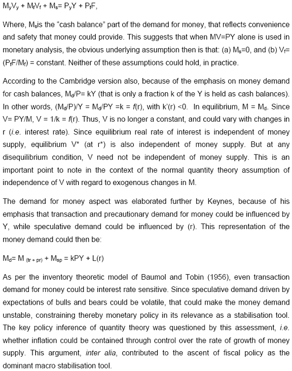 As close money substitutes become available, velocity may increase with higher interest rates (i.e., money demand declining with increase in the opportunity cost of money). Velocity crowding-out of the impact of QE in the US – An example of the importance of velocity for monetary analysis Massive liquidity injection and resultant expansion in base/broad money may coexist with no corresponding increase in nominal GDP (i.e. PY), if velocity falls sharply. In the US, large increases in both M1 and M2 have been offset nearly “one for one” by the decline in velocity - leading to velocity crowding-out - rather than increase in nominal GDP (i.e.PT). As could be seen from Panel Chart-1, M1has expanded by as much as US$ 0.4 trillion since December 2007, whereas M2 has increased only by about US$ 1.2 trillion (as against increase in base money of as high as US$ 1.5 trillion). More importantly, while M1 has increased by about 30 per cent since December 2007, the M1 velocity has dropped by 2 (from 10 to 8) suggesting a large enough (almost 200 per cent) contractionary impact, more than offsetting the expected positive impact of M1 expansion on nominal GDP. M2 in turn has increased by about 20 per cent since December 2007, and the fall in velocity from 1.9 to 1.7 (or by 0.2, equivalent of 20 per cent fall in money) implies almost “one-for-one” offset for the expected impact of expansion in M2 on nominal GDP. The fall in velocity has both conventional and non-conventional dimensions. Conventionally, in the midst of a crisis, money injected by a central bank may not get distributed efficiently through the banking system to non-banks. That may imply fall in velocity, as well as lower growth in M2. If the crisis does not involve a bank run by depositors, then demand for safer form of money (i.e. currency and demand deposits) may increase, as a result of which M1 may show strong growth. In the US, with interest rate falling to near zero, the opportunity cost of money also became negligible, which partly explains higher demand for narrow money. Sharper fall in velocity of M1 is because of reluctance among banks as well as the public to part with liquidity. The non-conventional dimension of the collapse in velocity is the sudden and significant unwinding of financial innovations. In the MV=PT assessment, T should include financial transactions as well, but in practice output (Y) is used as a proxy for transactions in monetary analysis. In a liquid market, growth in financial innovations could imply large decline in velocity. Given the manner in which the velocity is derived (i.e. nominal GDP/money stock), the impact of growth in financial innovations and subsequent collapse is difficult to explain through trends in “measured” velocity.  According to Fisher, during the Great Depression both money supply and velocity had declined (which precipitated the recession). Between October 1929 and March 1932 while the money stock had declined by 13 per cent, the velocity had also fallen by 72 per cent. During the recent Great Recession, however, the Fed prevented monetary contraction, but velocity declined. A central bank can only print more money, but it cannot arrest falling velocity driven by collapsing confidence of the public about the financial system. This highlights why money velocity is so important to the analysis of monetary aggregates or quantity based monetary policy actions. Some common misconceptions about velocity of money Since velocity is important to monetary analysis, it is important to avoid some of the common misconceptions about velocity. First, velocity is not a substitute of money; i.e. it cannot be a determinant of nominal income or inflation. This is because velocity is never the “cause” but always the “effect”, depending on how the financing of transactions and associated demand for money may change. The causality, thus, can only be from transactions to velocity, not the other way round. In the case of money, however, causality could be bi-directional; excess money supply can raise nominal income and prices, assuming the money supply process to be exogenous. Similarly higher demand for money resulting from higher nominal growth in GDP could cause money supply to increase, making the money supply process endogenous. In the latter case, however, if velocity increases, then money growth may not match the increase in nominal income. Thus, velocity is important to explain the behaviour of money growth, but it is not a substitute of money. Velocity is always passive, and it does not cause anything. Second, velocity is not the same thing as money multiplier. Money multiplier explains the process through which the “base money” created by a central bank multiplies in the banking system to the stock of broadmoney (M3) at any point of time. Currency to deposit ratio (which depends on the behaviour of the public), required reserves to total deposits (which depends on the central bank policy) and excess reserves maintained by banks with the central bank as percentage of total deposit liabilities (which depends on the behaviour of commercial banks) are the key determinants of money multiplier. The money multiplier is the link between “broad money” and “reserve money”, whereas velocity is the link between “broad money” and “nominal GDP”. While money multiplier could be derived as “broad money/reserve money”, velocity is derived as “nominal GDP/broad money”. Velocity refers to the number of times the available money stock may roll over or change hands to finance transactions equivalent of nominal GDP, whereas money multiplier is the magnitude by which base money is amplified in the banking system to the stock of broad money. Third, a very common perception has been that money growth alone is the culprit, and hence must be always contained, consistent with a money growth policy rule. This approach could be particularly dangerous in an environment of sharp f