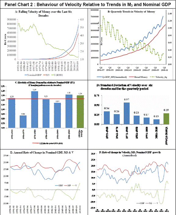 Section V: Concluding Observations Persistent and accelerated decline in the value of money cannot materialize unless accompanied by corresponding large expansion in the stock of money. This is a fundamental macroeconomic principle, notwithstanding the animated debate on alternative monetary policy frameworks and suitability of any one of them for any specific country. In the pre-global crisis period, the de-emphasis on monetary and credit aggregates was primarily driven by dissatisfaction with monetary targeting. In the post-crisis period, there seems to be a return of the emphasis on money and credit aggregates, but largely due to the realisation about the role of leverage in causing a financial crisis or sustained easy money conditions fuelling asset price bubbles, rather than money replacing the interest rate instrument for attaining monetary policy goals relating to inflation or output. Money growth remains a key medium-term determinant of inflation, but deviations from trend growth in money in the short-run must not be resisted, since such deviations may be justified by short-term shocks to money demand, and hence to money velocity. What becomes important for a central bank then is to explain the monetary trends in its communications, particularly deviations from the normal trend, through analysis of short-run shocks to money velocity. As shown in this paper, the money velocity has exhibited a sustained declining trend over last six decades, and this pattern cannot be seen as a source of uncertainty in the assessment of money, output and prices relationship. The major uncertainty though has been the short-term shocks to velocity, which seem to be particularly significant during periods of crises (such as the South East Asian crisis, the bursting of the IT bubble or the global financial crisis), episodes of oil/commodity price spirals, or even the domestic balance of payments crisis in the early 1990s and periods of sharp swings in domestic asset prices. As shown in the paper, the pace of decline in velocity accelerated for India during 2008-09. The more than normal pace of decline in velocity reflected the post-crisis concerns in the financial system, including the impact of the confidence channel of contagion. In 2010-11, however, the return to the normal trend implied an increase in incremental velocity, which in turn explains why the money growth remained subdued during the year. Even though the more obvious factor highlighted in explaining the subdued growth in M3 has been the moderation in the growth of deposits (which account for about 85 per cent of M3), the increase in velocity explains why a lower rate of money growth could coexist with a high growth in nominal GDP in 2010-11 that resulted from both robust growth and high inflation. This paper highlights that velocity crowding-out effects at times could be large in the short-run, and more importantly, significant enough to distort the information content of money growth for macroeconomic analysis. In India, as in other EMEs, the income velocity of money has exhibited a declining trend over last six decades, which reflects the dominant impact of growing monetisation of the economy. Financial inclusion initiatives and the associated further monetisation could sustain the declining trend going forward, even though further deepening of financial markets and financial sector reforms could weaken the pace of moderation in velocity. This forward looking assessment could be relevant for setting the indicative money growth trajectory every year and also for explaining the trends in monetary aggregates relative to trends in other macroeconomic variables, in particular output and prices. It is also important to monitor possible sources of short–run shocks to money demand, and hence sudden shifts in the pattern of velocity. Empirical estimates of this paper suggest that GDP, interest rate and financial deepening are the major determinants of velocity, but the dummy variable representing short-term shocks is also statistically significant. As a result, at times, lower growth in M3 relative to normal trend consistent with output and price trends need not necessarily imply tightening of monetary conditions. Similarly, higher growth in M3, at times, relative to normal may not have to be seen as a risk to inflation. Short-run trends in money growth should be seen along with expected changes in velocity. In the medium-run, however, velocity could be expected to remain anchored to the long-run trend, and hence, money growth in the medium-term is more likely to be consistent with the inflation and output trends than in the short-run. References: Bordo, Michael D., and Lars Jonung, “The Long-Run Behavior of the Velocity of Circulation: The International Evidence”, Cambridge: CambridgeUniversity Press, 1987. Brunner, Karl and Allan H. Meltzer (1962), “Predicting Velocity: Implications for Theory and Policy”, Paper presented at the joint meeting of the American Finance Association and the Econometric Society in Pittsburgh, December 29. DeLong, J Bradford (2009), “Simple Keynesianism for Monetarists: A Primer”, University of California at Berkeley and NBER. El-Shagi, Makram and Sebastian Giesen (2010), “Money and Inflation: The Role of Persistent Velocity Movements”, March 04, Halle Institute for Economic Research. Farmakis, Lefteris and Laurent Bilke (2011), “Modelling Money Velocity: A Cross Country Analysis”, Nomura –Macro Insights, February 22. Friedman, M (1956), “The Quantity Theory of Money: A Restatement”, In Studies in the Quantity Theory of Money (Ed.) Chicago; University of Chicago Press. Friedman, M (1968), “The Role of Monetary Policy”, Presidential Address, American Economic Association. Fisher, I (1911), “The Purchasing Power of Money”, London, Macmillan. Hetzel, Robert L (2004), “How Do Central Banks Control Inflation?”, Federal Reserve Bank of Richmond Economic Quarterly, Vol. 90/3. Humphre