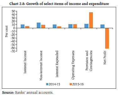Consolidated operations1 2.1 The consolidated balance sheets of the banking sector continued to grow at a modest pace during 2015-16 with assets/liabilities expanding at 7.7 per cent as compared to 9.7 per cent in 2014-15 (Chart 2.1). A high and rising proportion of banks’ delinquent loans, particularly those of public sector banks (PSBs) and a consequent increase in provisioning for non-performing assets (NPAs) continued to weigh on credit growth reflecting their lower risk appetite and stressed financial position. Consequently, growth in loans and advances of PSBs decelerated to 2.1 per cent in 2015-16 from 7.4 per cent in the previous year (Chart 2.2). On the liability side, moderation in deposit growth was commensurate. Current and saving account deposits 2.2 During 2015-16, SCBs’ low-cost current and saving account (CASA) deposits posted marginally higher growth as compared to the previous year. Both private sector banks (PVBs) and foreign banks (FBs) witnessed higher growth in CASA deposits as compared to PSBs (Chart 2.3). Credit-deposit ratio 2.3 While the credit-deposit (C-D) ratio of the banking system remained around 78 per cent, it was significantly higher at 90.3 per cent for PVBs as at end-March 2016 (Chart 2.4). Maturity profile of liabilities and assets 2.4 Almost half of the total deposits and borrowings of the banking sector were short-term in nature as at end-March 2016 (Chart 2.5). Long-term assets financed by short-term liabilities showed an increase during 2015-16 (Chart 2.6). Off-balance sheet operations 2.5 During 2015-16, banks’ off-balance sheet operations contracted. Forward exchange contracts which accounted for more than 86 per cent of the total off-balance sheet liabilities of banks in 2015-16 declined by 4.9 per cent during the year (Chart 2.7). The share of FBs in total off-balance sheet operations of the banking sector remained the highest at 50.9 per cent, followed by PSBs (25.7 per cent) and PVBs (23.4 per cent). Financial performance of SCBs 2.6 During 2015-16, SCBs’ interest earnings and non-interest incomes were adversely affected. Interest income reflected the impact of the continuing slowdown in credit growth. Interest expended also witnessed deceleration. However, growth in net interest income declined as compared to the previous year. Further, operating expenses showed an improvement largely due to moderate growth in the wage bill. Provisions and contingencies surged due to a sharp deterioration in asset quality. Provisioning for NPAs more than doubled on account of improved recognition of non-performing assets. This led to a more than 60 per cent drop in net profits for the banking sector as a whole though it remained in the positive zone (Chart 2.8). Bank group-wise, PVBs and FBs reported net profits while PSBs incurred losses. PSBs reported losses to the tune of ₹180 billion with net profits declining by 148 per cent over the previous year.  2.7 Net interest margin (NIM) came under further pressure during the year due to loss of interest from standard assets slipping into NPAs, the impact of implementation of the Ujwal DISCOM Assurance Yojana (UDAY) leading to lower yields and adoption of the marginal cost lending rate (MCLR) during a decreasing rate scenario. Lower costs of funds could not offset the decline in NIM. Spread marginally increased in 2015-16 (Chart 2.9). 2.8 During the year, major indicators of profitability, that is, banks’ return on assets (RoA) and return on equity (RoE) showed a substantial decline as compared to the previous year, reflecting the impact of a sharp decline in net profits. PSBs reported negative RoA (Table 2.1). | Table 2.1: SCBs’ return on assets and return on equity (bank group-wise) | | (per cent) | | Sr. no. | Bank group | Return on assets | Return on equity | | 2014-15 | 2015-16 | 2014-15 | 2015-16 | | 1 | Public Sector Banks | 0.46 | -0.20 | 7.76 | -3.47 | | | 1.1 Nationalised Banks* | 0.37 | -0.49 | 6.44 | -8.52 | | | 1.2 The State Bank Group | 0.66 | 0.42 | 10.56 | 6.78 | | 2 | Private Sector Banks | 1.68 | 1.50 | 15.74 | 13.81 | | 3 | Foreign Banks | 1.84 | 1.45 | 10.24 | 8.00 | | 4 | All SCBs | 0.81 | 0.31 | 10.42 | 3.59 | Notes: Return on assets = net profit/average total assets. Return on equity = net profit/average total equity. * Nationalised banks include IDBI Bank Ltd and Bharatiya Mahila Bank Ltd. Source: Banks’ annual accounts. | Bank group-wise share in assets and profits 2.9 The declining trend in the share of assets and profits of PSBs continued during 2015-16 reflecting slower growth in assets and large losses (Chart 2.10). Recovery of NPAs 2.10 Banks have been making all efforts to reduce their non-performing assets through various legal channels like resolutions through Lok Adalats, Debt Recovery Tribunals (DRTs) and invocation of SARFAESI. However, the amount recovered by all SCBs during 2015-16 reduced to ₹227.68 billion as against ₹307.92 billion during the previous year (Table 2.2). PSBs, which are burdened with a high proportion of the banking sector’s NPAs, could recover only ₹197.57 billion as against ₹278.49 billion during the previous year (Table 2.3). The deceleration in recovery was mainly due to a reduction in recovery through the SARFAESI channel by 52 per cent from ₹256 billion in 2014-15 to ₹131.79 billion in 2015-16. On the other hand, recovery through Lok Adalats and DRTs increased. | Table 2.2: SCBs’ NPAs recovered through various channels | | (Amount in ₹ billion) | | | 2014-15 (Revised) | 2015-16 | | Channel of Recovery | No. of cases Referred | Amount involved | Amount Recovered * | No. of cases Referred | Amount involved | Amount Recovered * | | Lok Adalats | 29,58,313 | 309.79 | 9.84 | 44,56,634 | 720.33 | 32.24 | | DRTs | 22,004 | 603.71 | 42.08 | 24,537 | 693.41 | 63.65 | | SARFAESI | 1,75,355 | 1,567.78 | 256.00 | 1,73,582 | 801.00 | 131.79 | | Total | 31,55,672 | 2,481.28 | 307.92 | 46,54,753 | 2,214.74 | 227.68 | Note: * refers