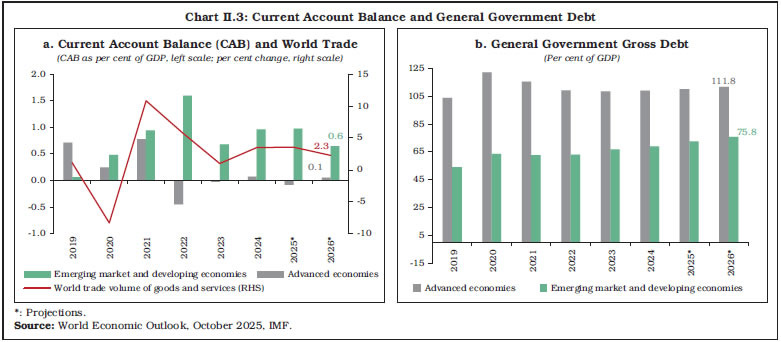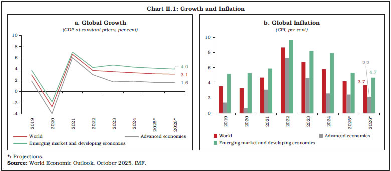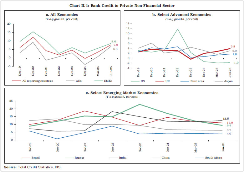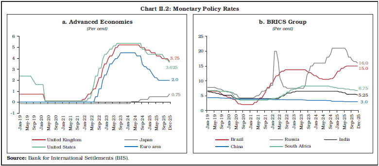 The global banking sector remained resilient as reflected in strong capital buffers, high leverage ratio and improved profitability. Despite its current strength, global GDP growth is expected to slow down amidst trade policy uncertainty, while inflation to moderate. Central banks have responded with monetary policy easing. Global regulatory and supervisory initiatives have been directed at addressing concerns emanating from interconnectedness of banks and non-banks as well as integration of artificial intelligence and crypto-assets into the financial system. Policy makers need to remain vigilant to the evolving risks in the financial system amidst rising trade and geopolitical uncertainty, technological innovations and climate risks. Introduction II.1 The global economy showed resilience during 2025, supported by front-loaded imports, easing financial conditions and stimulative fiscal stance in major economies, albeit with some signs of slowdown in the second half. Inflation remained benign, aided by softer energy prices and subdued demand. Trade policy uncertainty, geoeconomic fragmentation, geopolitical tensions and high debt levels, however, weigh on the economic outlook. II.2 The global banking sector successfully navigated these challenges, benefiting from strong capital buffers and improved profitability. Global financial markets remained volatile, albeit with low funding spread and rebound in equity prices. The role of non-bank financial intermediaries (NBFIs) is growing in the capital market and credit intermediation. Yet, valuation of risky assets appears stretched amid slowing global growth and expansion in banks’ exposure to NBFIs. These global shifts can create vulnerabilities in the financial system. With debt continuing to shift towards the government sector and exposure of banks and non-banks remaining elevated, stress in sovereign bond markets can be transmitted directly to banks. The growing size of NBFIs along with banks’ rising exposure raises concerns about risk-taking and interconnectedness in the financial system. Global foreign exchange markets remain vulnerable to macrofinancial uncertainty, raising risks of spillover into other asset classes and tightening of financial conditions. Policymakers remain attentive to risks from leverage, liquidity mismatches, and cross-border spillovers, even as financial innovations such as stablecoins and the use of artificial intelligence (AI) reshape market structures and supervisory practices. In this environment, strengthening of financial sector regulation and supervision remains crucial for financial stability. II.3 Against this backdrop, this chapter covers developments in the global banking sector. Section 2 reviews current global macroeconomic conditions. Section 3 discusses recent global banking policy developments. The financial performance of the global banking sector is examined in Section 4, followed by an analysis of world’s top 100 banks ranked by Tier 1 capital positions in Section 5. Section 6 concludes with an overall assessment. 2. Global Macroeconomic Conditions II.4 Global growth is projected to decelerate marginally to 3.2 per cent in 2025 and 3.1 per cent in 2026 from 3.3 per cent in 2024, amidst trade and geopolitical uncertainty.1 This reflects the resilience of the global economy, which is partly supported by front-loading of trade and investment, and fiscal expansion in some major economies. Nonetheless, global growth remains below the pre-pandemic historical average of 3.7 per cent.2 The risks to the outlook also remain tilted to the downside because of trade policy uncertainty and protectionism, which can dampen investment and disrupt supply chains. Emerging market and developing economies (EMDEs) are projected to grow by 4.2 per cent in 2025 and 4.0 per cent in 2026, as compared with 1.6 per cent for the advanced economies (AEs) (Chart II.1a). Easier financial conditions benefit EMDEs as they continue to demonstrate resilience on the back of improving policy frameworks. II.5 Global inflation remains benign, with headline inflation projected to decline to 4.2 per cent in 2025 and further to 3.7 per cent in 2026, supported by subdued demand and softer energy prices. Nonetheless, inflation is projected to converge back to target earlier in AEs (2.2 per cent in 2026) as compared to EMDEs (4.7 per cent) (Chart II.1b). II.6 Central banks responded to the easing of inflation and moderation in growth by reducing policy rates since the second half of 2024. This was a significant reversal from the extended period of monetary tightening by major central banks to counter the surge in inflation during 2022-2023. The policy path taken by central banks, however, varies across countries, driven by stickiness of inflation above target as well as growth and labour market concerns. The European Central Bank (ECB) reduced policy rates by a cumulative 250 basis points (bps) since its first rate cut in June 2024, while the Bank of England reduced rate by a total of 150 bps since the onset of its easing cycle in August 2024. The US Federal Reserve started easing policy rate in September 2024, with a cumulative reduction of 175 bps so far. In contrast, the Bank of Japan adopted a monetary tightening cycle, with a cumulative increase of 85 bps since March 2024 to curb rising inflation (Chart II.2a). Amongst the BRICS group, South Africa cut the policy rate in September 2024, followed by India in February 2025 and Russia in June 2025. After a pause since August 2023, China further reduced the rate in July 2024. Brazil, however, adopted a monetary tightening cycle since September 2024, increasing the policy rate by 450 bps, to bring inflation down to its target (Chart II.2b).  II.7 World trade remained robust despite protectionism, driven by front-loaded imports and exports in response to proposed high US import tariffs. Global trade volume is projected to grow faster at 3.6 per cent in 2025, before slowing down to 2.3 p