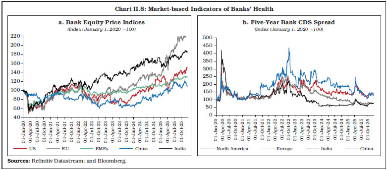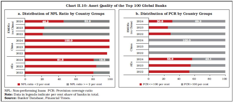 4.6 Financial Market Indicators II.36 Tariffs and trade policy uncertainty are associated with increased financial market volatility. After abrupt tightening post April 2, 2025 tariff announcement, the rebound in asset prices globally alongside a weaker dollar eased financial conditions around the world. Bank equity prices, particularly in the Euro area, fell sharply following the US tariff announcement on April 2, 2025, reflecting investor concerns about rising trade tensions and their potential impact on global growth and financial stability. However, post a 90-day pause on implementation of tariffs announced on April 9, the stock indices showed signs of recovery. Recently, stronger-than-expected European bank earnings, which were boosted by trading on market volatility, have supported their stock prices (Chart II.8a).36 After the recent peak in April 2025, following the tariff announcement, the credit default swap (CDS) spreads have narrowed, reflecting improved market sentiment and lower perceived default risk (Chart II.8b). 5. World’s Largest Banks II.37 The list of top 100 global banks, based on their Tier 1 capital, continues to be dominated by China in 2024. (Chart II.9a). In terms of total assets, the distribution shifted between 2020 and 2024, with AEs holding a smaller share, and both China and other EMDEs increasing their respective shares (Chart II.9b). The trend of declining international business and growing focus on local markets continued for the largest banks in AEs.  II.38 In 2024, the asset quality of banks in EMDEs improved, as reflected in the lower proportion of banks with NPL ratios greater than or equal to 2 per cent as compared to the previous year. In contrast, there was a marginal deterioration in the asset quality of banks in AEs. Additionally, all Chinese banks in the top 100 global banks list consistently maintained their NPL ratios below 2 per cent (Chart II.10a). The provision coverage ratio, an indicator of loss absorbing capacity, of all Chinese banks in the top 100 banks, remained above 100 per cent. In other EMDEs, the share of banks with PCR more than 100 per cent decreased to 69.2 per cent in 2024 from 75.0 per cent a year ago. In contrast, more than 50 per cent of the banks in AEs had PCR below 100 per cent. (Chart II.10b).