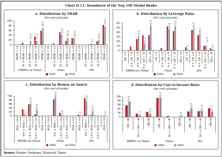 II.39 The global banking system showed resilience as banks remained well capitalised. In 2024, the modal class for capital adequacy ratio for banks in EMDEs (excluding China) and AEs was greater than or equal to 16 per cent, while the modal class of banks in China remained in the 12–14 per cent band. China and other EMDEs showed an increase in the share of banks in the highest capital bracket in 2024 vis-à-vis 2020 (Chart II.11a). Leverage ratio, calculated as ratio of Tier 1 capital to total assets, of large global banks strengthened in 2024. Banks in China and other EMDEs showed a notable improvement in leverage ratios, with modal class shifting upwards. In AEs, the modal class remained at four to six per cent (Chart II.11b). II.40 In terms of profitability, top banks in EMDEs (excluding China) continued to demonstrate superior profitability than AE and Chinese counterparts. EMDEs had higher concentration of banks with return on assets (RoA) in the range of one to two per cent in 2024. In China, about 95 per cent of the banks had RoA in the range of zero to one per cent (Chart II.11c). Cost-to-income ratio is a key measure of operational efficiency of the bank. Chinese banks demonstrated greater efficiency than their counterparts in both emerging and advanced economies, as indicated by their consistently lower cost-to-income ratio (Chart II.11d). 6. Overall Assessment II.41 The global macroeconomic conditions remained in a state of flux amidst trade tensions and geoeconomic fragmentations. The risks to growth outlook remain tilted to the downside. With growth moderating and inflation falling, most central banks continued with monetary policy easing cycles since 2024. The global banking sector remained broadly resilient supported by stronger capital positions and improved profitability, although bank credit growth moderated in 2024. While exposures to non-bank financial institutions pose potential vulnerabilities, system-wide stress indicators remain contained.  II.42 Continued vigilance through robust supervision, effective macroprudential frameworks, and enhanced oversight of interconnectedness will be crucial to safeguard financial stability and to ensure that banks remain a reliable conduit for supporting global growth. Apart from prudent regulation and supervision, fiscal discipline and calibrated monetary policy actions also remain crucial for macro-financial stability in a state of heightened global uncertainty. |