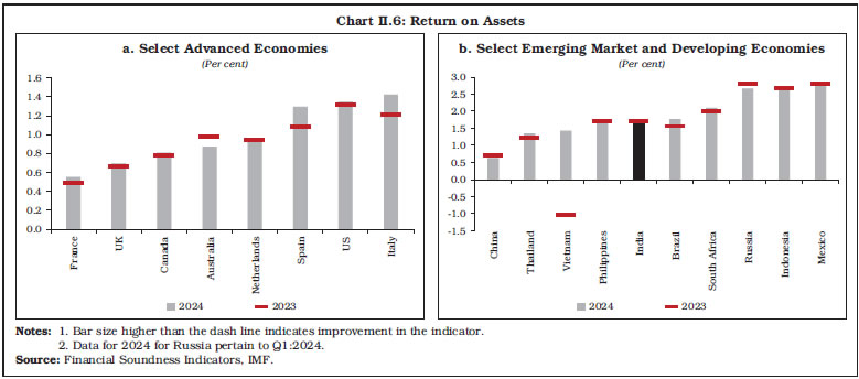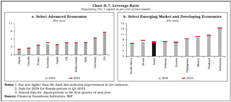 II.34 Amongst AEs, banks in the UK maintained high capital buffers, while banks in the US maintained lower CRAR, albeit with some improvement in 2024. In the Euro area, high internal capital generation in the form of retained earnings continued to have a strong positive effect on banks’ capital ratios.34 The capital ratios in EMDEs show a mixed pattern, with Indonesian banks maintaining CRAR above 25 per cent in 2024 (Table II.3). 4.5 Leverage Ratio II.35 Leverage ratio, defined as regulatory Tier 1 capital to total assets, measures the extent to which bank assets are funded by equity, serving as a safeguard against excessive risk taking. Banks in both AEs and EMDEs maintained leverage ratio well above the minimum Basel III requirement of 3.0 per cent. Among AEs, banks in the US continued to maintain high leverage ratio (Chart II.7a). The ECB, in December 2024, subjected banks to increased capital on account of the risk of excessive leverage. Bank-specific mandatory requirements under the leverage ratio Pillar 2 requirement ranged between 10 and 40 basis points, in addition to the minimum required 3 per cent leverage ratio.35 Banks in EMDEs generally maintained higher leverage ratio than AEs and the ratio improved in many economies in 2024 (Chart II.7b). | Table II.3: Regulatory Capital to Risk-weighted Assets Ratio | | (Per cent) | | Country | 2015 | 2020 | 2023 | 2024 | Q1:2025 | Q2:2025 | | 1 | 2 | 3 | 4 | 5 | 6 | 7 | | Advanced Economies | | Australia | 13.8 | 17.6 | 19.9 | 20.2 | 20.5 | N.A. | | Canada | 14.2 | 16.1 | 17.1 | 16.8 | 16.9 | 17.5 | | Japan | 15.9 | 16.6 | 16.4 | 16.7 | 16.7 | N.A. | | UK | 19.6 | 21.6 | 21.3 | 21.3 | 20.7 | 20.5 | | US | 14.1 | 16.3 | 15.9 | 16.3 | 16.3 | 16.8 | | Euro Area | | France | 16.4 | 19.5 | 19.5 | 19.8 | 19.8 | N.A. | | Germany | N.A. | N.A. | 19.9 | 20.5 | 20.1 | 20.5 | | Italy | 14.8 | 19.3 | 19.4 | 19.7 | N.A. | 19.8 | | Netherlands | 20.1 | 22.8 | 21.1 | 20.9 | 21.2 | 21.6 | | Spain | 14.7 | 17.0 | 17.1 | 17.5 | 17.8 | 17.8 | | Emerging Market and Developing Economies | | Brazil | 16.4 | 19.1 | 17.9 | 17.1 | 17.0 | N.A. | | China | 13.5 | 14.7 | 15.1 | 15.7 | 15.3 | 15.6 | | India | 12.7 | 15.6 | 15.6 | 16.4 | 17.0 | 17.4 | | Indonesia | 18.9 | 22.1 | 25.8 | 25.1 | 23.7 | 24.3 | | Mexico | 15.0 | 17.7 | 18.8 | 19.1 | 19.9 | 20.0 | | Philippines | 15.3 | 16.3 | 16.3 | 15.8 | 15.9 | 15.7 | | Russia | 12.7 | 13.8 | 13.1 | 12.9 | N.A. | N.A. | | South Africa | 14.2 | 16.6 | 16.1 | 16.3 | 16.1 | N.A. | | Thailand | 17.1 | 19.8 | 19.6 | 20.1 | 20.4 | N.A. | | Vietnam | 12.8 | 11.1 | 11.7 | 12.3 | 12.4 | N.A. | N.A: Data not available. Notes: 1. Data for 2024 for Russia pertain to Q1:2024. 2. Annual data for Japan pertain to the first quarter of next year. Source: Financial Soundness Indicators, IMF. |