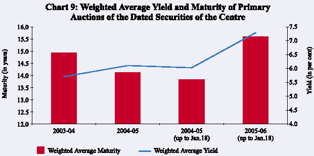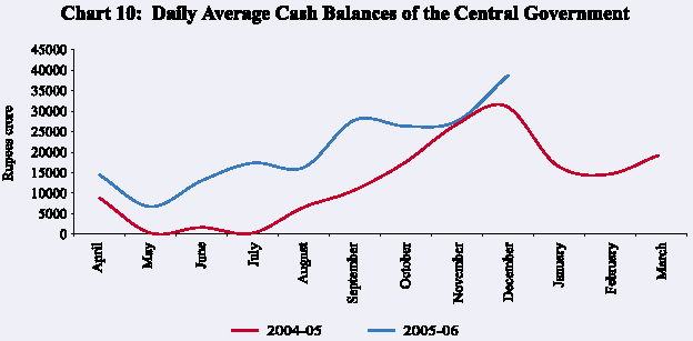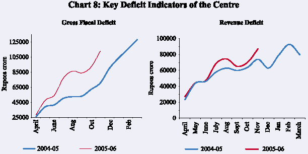 The available information on finances of the Central Government for the first eight months of 2005-06 (April-November) indicates an improvement in key fiscal variables due to a continued buoyancy in the tax collections and containment of growth in non-Plan expenditure. Although revenue deficit, as per cent of budget estimates, was lower in April-November 2005 than a year ago, fiscal deficit and primary deficit were higher than a year ago (Table 12). Adjusting for debt swap receipts of Rs. 32,066 crore in April-November 2004, fiscal deficit and primary deficit, as proportion to budget estimates, were, however, lower in April-November 2005 than a year ago. The surplus cash balance with the Reserve Bank has been higher during 2005-06 so far, which is expected to provide flexibility to the Central Government in managing its expenditure flows for the remaining part of the year.