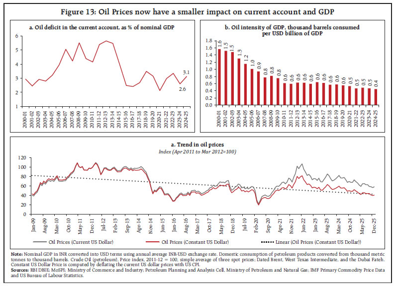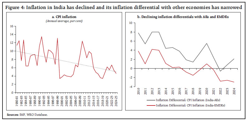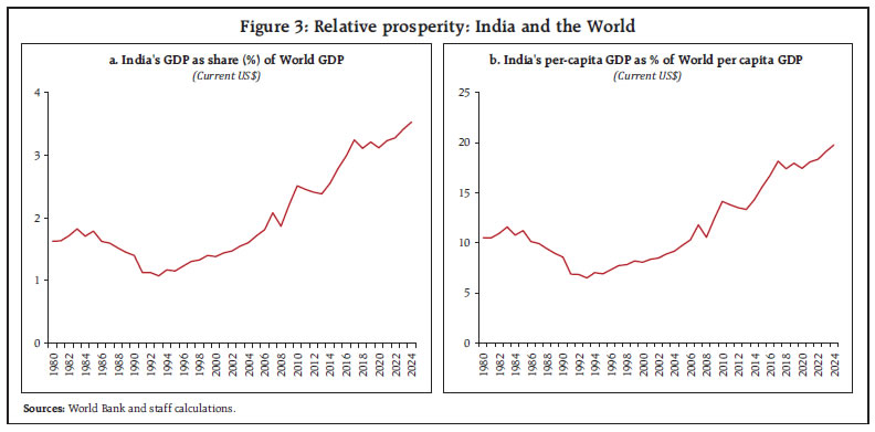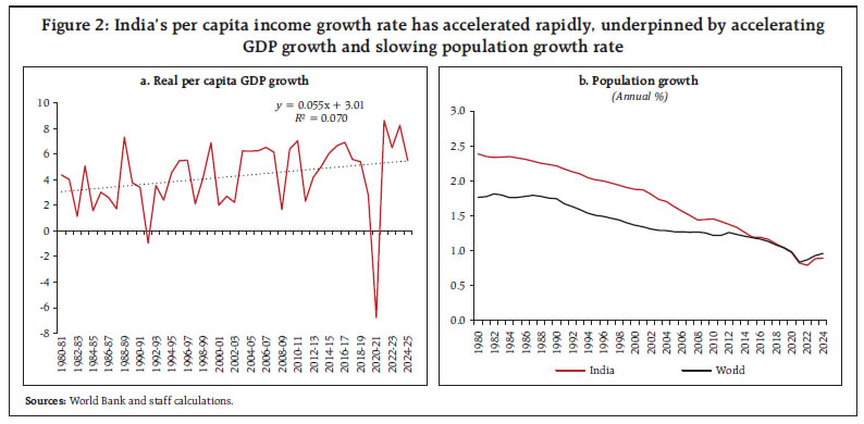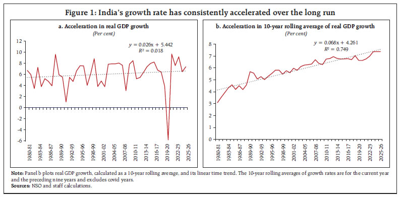 It is my pleasure and honour to deliver the 14th Foundation Day Lecture of the Centre for Development Studies (CDS). Established in October 1970 by Professor K. N. Raj, CDS has been a premier academic institute in India for social science and development research. CDS's footprints in economic research have been evident through its pioneering work on human development, labour, industry, international trade, migration, decentralisation and local governance, among others. The topic that I have chosen for my talk today is on some of the salient features of India's economic growth in recent years and how they may be contextualised over the past four decades. I focus on three defining features of India's growth trajectory: first, its sustained momentum and gradual acceleration; second, the coexistence of rapid expansion with macroeconomic stability; and third, a demonstrated resilience reflected in increasingly stable and predictable economic outcomes. Where appropriate, these patterns are situated in a comparative cross-country perspective. 1. Economic growth has accelerated slowly but surely Looking at the pace of economic growth in India since the 1980s, it is easily observable that the Indian economy has slowly but surely accelerated, at the pace of 0.03 percentage points a year on an average, during the past four and a half decades (Figure 1, Panel a). While growth rate averaged 5.7 per cent during 1980s, it improved to 5.8 per cent in the following decade; to 6.3 and 6.6 per cent during the decades of 2000s and 2010s, respectively; and further to 7.7 per cent during the last four years (Table 1). Ten-year rolling averages of annual GDP growth rate confirm the trend acceleration, as well as the fact that there have not been any periods of prolonged stagnation or secular decline in growth (Figure 1, Panel b). | Table 1: GDP growth in India across decades | | Period | Annual average real GDP growth (per cent) | | 1980-81 to 1989-90 | 5.7 | | 1990-91 to 1999-2000 | 5.8 | | 2000-01 to 2009-10 | 6.3 | | 2010-11 to 2019-20 | 6.6 | | 2022-23 to 2025-2026* | 7.7 | Note: * Excluding the covid years of 2020-21 and 2021-22. Sources: NSO and staff calculations. | The acceleration in per capita income growth has been even faster than in GDP growth (Figure 2).2 From a modest level of US$ 274 in 1981, and US$ 306 in 1991, India's per capita income has increased nearly tenfold to about US$ 2700 in 2024. From 1981, it took about 23 years to double the per capita income whereas in the subsequent 22 years it has increased almost five-fold. As per October 2025 forecasts in the World Economic Outlook of the IMF, per capita income is projected to increase to US$ 2818 in 2025, US$ 3051 in 2026 and US$ 4346 in 2030. Decline in population growth has been an important factor contributing to the acceleration in per capita income. India's population growth has traditionally been significantly higher than that of the world. However, over the years it has declined at a faster rate than the global rate and, since about 2014, at par with the growth rate in world population (Figure 2, Panel b). India has experienced a rapid decline in fertility rates since the 1980s. While the death rate has been declining too and has fallen below world average (See Annex 1, Figure A1, Panel a), the pace of decline in fertility rate has been faster than the decline in death rate, resulting in a slowing rate of population growth.3 These trends are indicative of the impact of increasing prosperity and education levels on demography. Going by international experience, these trends are likely to continue in the years to come, aiding a rapid increase in per capita incomes.  Since the early 1990s, the Indian economy has been growing much faster than the rest of the world. As a result, share of the Indian economy in the global economy has increased about 3 times, from about 1.1 per cent in 1991 to 3.5 per cent in 2024 (Figure 3, Panel a). The differential in growth rates has further widened in the last decade or so. Meanwhile, India's per capita GDP, as a percentage of world per capita GDP, has also increased threefold, from about 7 per cent in 1991 to close to 20 per cent in 2024 (Figure 3, Panel b). These are in current US$ terms; in Purchasing Power Parity (PPP) terms, India's per capita GDP relative to world per capita GPD is much larger. We examine whether the observed growth acceleration is specific to India or reflects a broader pattern across other emerging markets. To assess this, we compare India's linear growth trend with that of seven major emerging economies; Brazil, the Russian Federation, South Africa, Malaysia, Mexico, Türkiye, and Indonesia — collectively denoted as the EM7.4 Results presented in Annex 2 indicate that this group of countries, at the aggregate level, did not witness an acceleration in growth. However, the trend in India's 10-year rolling average growth rate is significantly positive. The positive coefficient on Trend × India suggests a steeper growth trajectory for India relative to the EM7 economies as well. 2. Indian economy has experienced a virtuous cycle of accelerated growth and macroeconomic stability An economy is typically assessed to be macroeconomically stable if specific outcomes (commonly, inflation, current account deficit, fiscal deficit, quality of public debt and deficit, and those pertaining to the financial sector) are seen to be sustainable, growth supportive, and not indicative of excessive underlying risks or overheating.5 For India, most of these indicators have remained in a healthy range over the last four decades with notable improvement in recent years. Inflation has both moderated over time and has become more stable, especially under the flexible inflation targeting (FIT) regime. Average annual CPI inflation in India has declined from close to 10 per cent in the 1990s to about 6 per cent a year in the subsequent two decades; to below 5 per cent in the last four years; and is like