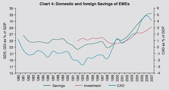 Though it is true that GDP growth remained high during the phases of heavy capital flows, it is not clear whether capital inflows increased growth in EMEs. Findings of many studies show that capital inflows used to be high during the phases of high economic growth and they are procyclical in nature. It has been justified that capital account liberalization by fulfilling the investment demand in capital poor countries enhances economic benefits. However, a converse can be observed from Figure 4 that EMEs have higher saving rates than investment rates during 2000s.
