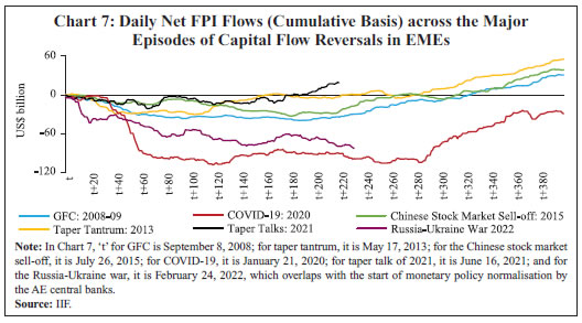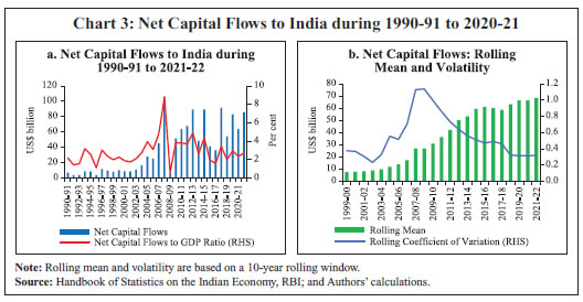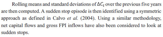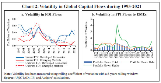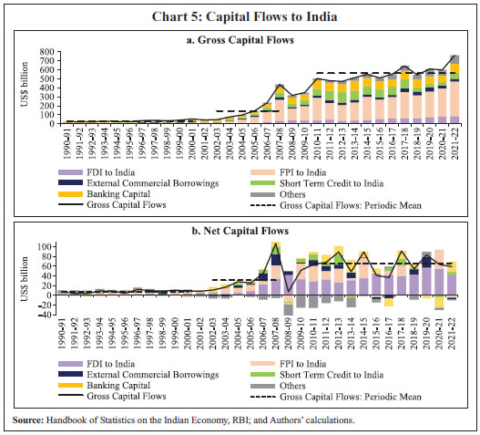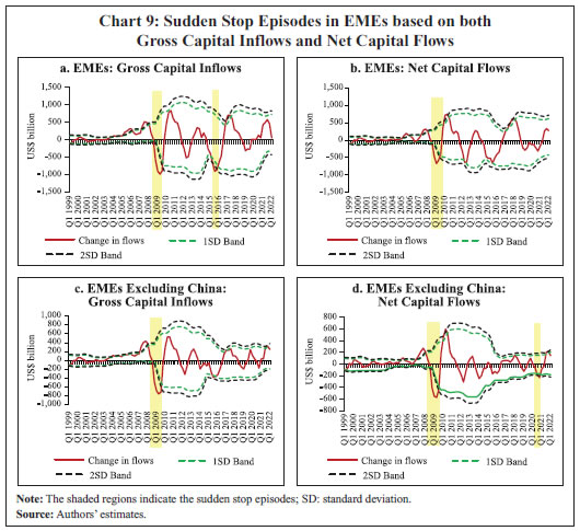 Sujata Kundu, Anshu Kumari and Deepika Rawat* Received: November 3, 2022 Accepted: January 11, 2024 The paper studies the evolving dynamics in cross-border capital flows, with an emphasis on the emerging market economies (EMEs) covering a timeline of three decades (Q1:1992-Q1:2022). In view of the persistent volatility in capital flows to EMEs, the paper examines major episodes of capital flow reversals, in particular sudden stops. The empirical analysis suggests that global factors – global growth, risk, liquidity, long-term interest rates, policy rate changes – along with domestic growth and nominal exchange rate dynamics are key drivers of capital flow reversal episodes in the EMEs. The appropriate utilisation of capital flow management measures (CFMs) and macroprudential policy measures (MPMs), along with a strengthening of domestic macroeconomic and financial fundamentals and adequate buffers in the form of foreign exchange reserves, can help the EMEs navigate the ebbs and surges in capital flows better, while preserving macroeconomic and financial stability. JEL Classification: F3, F32, F320, F41 Keywords: Capital flows, capital flow reversal, cloglog model, foreign portfolio investment, gross capital inflows, monetary policy communication, net capital flows, sudden stop, taper tantrum. Introduction International capital mobility has witnessed a significant surge since the early-1990s, led by both country-specific and global developments. While domestic pull factors, such as structural reforms, capital account liberalisation and stabilisation programmes in several emerging market economies (EMEs) improved creditworthiness, drove productivity gains and investors’ confidence in macroeconomic management, global push forces, such as the decline in real interest rates in the advanced economies (AEs) in the early-1990s also attracted foreign investors towards EMEs. Further, global easing in communication costs and increased competition led firms in AEs to locate their production centres in EMEs to garner production efficiency and profits. Moreover, as EMEs gradually moved towards capital account liberalisation, institutional investors discovered wider opportunities in EMEs for risk diversification. Consequently, the volume of capital flowing into EMEs rose, simultaneously resulting in risks of sudden shifts and reversals in capital flows and increased financial market volatility. From the standpoint of the EMEs, cross-border capital flows help in the mobilisation of external savings, which has been perhaps the strongest argument in favour of international capital mobility (Devlin et al., 1994). While from a macroeconomic perspective, net inflows of external savings supplement domestic savings, from the financial stability angle, gross capital flows provide insights into the international exposure of an economy (Lane and Milesi-Ferretti, 2007; Tarashev et al., 2016; OECD, 2018). Spillovers and contagions are often transmitted and amplified across economies via the channel of gross capital flows (BIS, 2021). Therefore, their impact is wide-ranging, affecting an array of macroeconomic parameters, including exchange rates, interest rates and foreign exchange reserves. Large capital inflows/ reversals are often associated with macroeconomic and financial sector disruptions (Calvo et al., 1993; Kamin and Wood, 1997; Lopez-Mejia, 1999; Kohli, 2001)1. The period since the 1990s has been eventful, characterised by extraordinary movements in global capital flows, not only in terms of their levels but also volatility along with extreme movements or capital flow “waves”2. After surging through the mid-2000s, capital flows contracted during the Global Financial Crisis (GFC) of 2008-09. An array of global events including highly accommodative monetary policies by the major AEs with policy rates close to zero or even negative (both after the GFC and the COVID-19 pandemic), the taper tantrum of 2013-14, Chinese stock market sell-off, the devaluation of the Chinese renminbi, the outbreak of COVID-19 in 2020, monetary policy normalisation by major AE central banks beginning 2021 and the Russia-Ukraine war in 2022 have imparted sizeable volatility to capital flowing into EMEs. Surges in capital flows and sudden stops3 have significant adverse effects on the EMEs. Capital flow reversals are generally sudden, large, disruptive and broad-based with a limited window for policy reactions. As capital flows often obey global factors and events, there is a need for policy preparedness and a careful monitoring of domestic and global macroeconomic conditions. Set against this background, this paper has two objectives. First, it attempts to study the evolving dynamics in global capital flows during the post-GFC period, with a focus on the EMEs. The paper provides an account of the major episodes of sudden stops for a sample of major EMEs, covering a period of 30 years (Q1:1992 to Q1:2022). Secondly, it examines the key drivers of such reversal episodes. The paper is structured as follows: Section II presents a review of the literature on identifying episodes of sudden stops in EMEs. Section III provides the stylised facts on capital flow developments globally and in India since the 1990s. Section IV discusses the empirical findings related to the identification and drivers of major episodes of capital flow reversals, distinguishing them from sudden stops. Section V concludes the paper. Section II Literature Review Following Calvo (1998), the balance of payments (BoP) accounting identity after subtracting errors and omissions rests on the following equation: where, KI, CAD and RA represent capital inflows, current account deficit and accumulation of international reserves, respectively. When a sudden stop occurs causing the financial account (FA) of the BoP to shift towards outflows, the current account (CA) balance has to improve (implying CAD in identity (1) must fall quickly and sizeably and transit towar