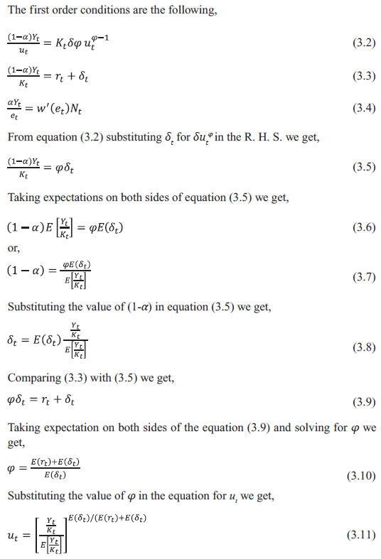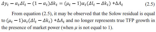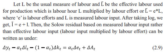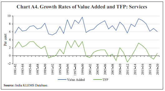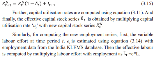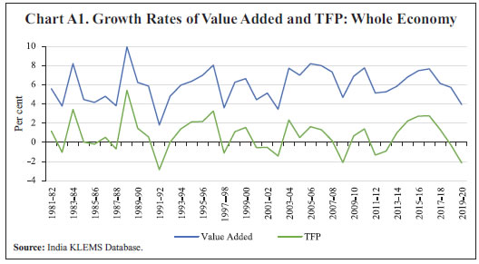 Dipika Das* Received: September 4, 2023 Accepted: December 8, 2023 This paper examines procyclicality in the estimates of Total Factor Productivity (TFP) in the Indian economy from 1981-82 to 2019-2020 based on the India KLEMS 2022 database. A major driver of the procyclicality could be the varying factor utilisation rate over the business cycle. In this paper, new TFP indices have been constructed, adjusting for the variable capital utilisation rate and labour efforts using a partial equilibrium model. The procyclicality of the adjusted TFP series, as indicated by correlation of TFP growth with value added growth, reduces from 0.88 for the unadjusted series to 0.75 for the adjusted TFP series for the economy as a whole. The procyclicality is more in labour-intensive manufacturing sectors, such as textiles, and services sectors, such as construction, hotels, business services, education and health care. JEL Classification: E32, D24 Keywords: Total factor productivity, business cycle, factor hoarding, production function estimation, constant returns to scale. Introduction Capital investment, labour and productivity growth are the three main drivers of economic growth. Growth based on factor accumulation may not be sustainable due to potential limitations on the availability of the factors in future and diminishing returns to factors. As a result, the sustainability of growth depends heavily on productivity growth, which is output growth that is not accounted for by factor accumulation. For instance, it has been stated that decline in productivity, which resulted from ageing population, weakening of research and development activities and technological progress, was one of the primary causes of the Japanese economy’s prolonged stagnation since 1990s, called as the “lost decade” (Yoshino and Taghizadeh-Hesary, 2015). Therefore, an on-going accurate measurement and assessment of productivity growth is critical for a robust understanding of economic growth, its drivers and appropriate policies. A commonly used measure of productivity is the Total Factor Productivity (TFP), which is traditionally computed using the growth accounting methodology or Solow residual; this measure is also followed in the India KLEMS database. For unbiased estimates, the Solow approach requires preconditions of perfect competition, constant returns to scale (CRS) and full capacity utilisation. Any deviation from these assumptions and/or an error in the measurement of inputs or outputs can lead to biases in the measurement of the Solow residual. In the years of strong expansion, the residual could be usually large and in the years of recession, it could be low or even negative. The trends of TFP growth along with value added growth for the whole economy as well as for different sectors - agriculture, manufacturing and services – as depicted in Annex, Chart A1 through A4, respectively, suggest a strong tendency for the TFP growth and value added growth to co-move. A positive correlation of 0.88 is observed between the two series for the Indian economy as a whole and 0.95, 0.91 and 0.63 for agriculture, manufacturing and services sectors, respectively. The literature has explored the sources of procyclicality in estimates of productivity, that is, rise of productivity in booms and fall in recessions. However, most of these studies have focused on labour productivity instead of TFP. Some of the early studies in this area, Gordon (1990), Burnside et al. (1993) and Burnside and Eichenbaum (1996) argued that the procyclicality resulted from measurement errors in labour and capital due to factor hoarding, especially labour hoarding. Hall (1990), Basu and Fernald (1995), and Basu and Kimball (1997) presented a different perspective which suggested that fluctuations in inputs may cause procyclical fluctuations in productivity, when there are imperfect competition conditions and increasing returns to scales at the firm level. Basu (1996) examined the relative significance of cyclical fluctuations in labour and capital utilisation, increasing returns to scale and technology shocks as explanations for procyclical productivity, concluding that cyclical factor utilisation was the most important factor. Cooley and Prescott (1995) suggested that productivity shocks, which are generated as Solow residuals are procyclical themselves and are the driving force for a business cycle, serving as the foundation for the real business cycle models. To explain cyclical movements in aggregate productivity, Basu and Fernald (2001) used a Dynamic General Equilibrium (DGE) model that took into account cyclical utilisation of factors of production, increasing returns to scale and reallocation of resources across sectors with different marginal products. Schmöller and Spitzer (2019) estimated a medium-scale Dynamic Stochastic General Equilibrium (DSGE) model in the Euro area and came to the conclusion that the major cause of the decline in productivity in the Euro area was the decline in the effectiveness of research and development (R&D) investment and non-adoption of new technologies. To the best of my knowledge, not many studies have been undertaken on the measurement of procyclical biases in productivity in India, especially at the economy level. This paper attempts to fill this gap by constructing TFP indices adjusting for variable capital utilisation rate and labour efforts over the business cycle, using a partial equilibrium model. The model is tested on the India KLEMS database to address biases by adjusting for the variable factor utilisation. The structure of the paper is as follows. Section II explains the various procyclical biases in the traditional TFP estimation. Section III describes the methodology and the data used. Section IV presents the empirical findings and their implications and Section V provides the concluding observations and direction for future research. Section II Biases in Traditional TFP Estimation Solow (195