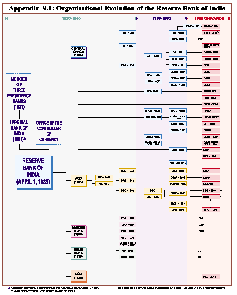 9.2 The Preamble to the Reserve Bank of India Act, 1934 stated that the Bank had been constituted ‘to regulate the issue of bank notes and keeping of reserves with a view to securing monetary stability in India and generally to operate the currency and credit system of the country to its advantage’. The Act provided for in-built flexibility, extra powers and manoeuvrability to the Bank in extraordinary circumstances. This chapter attempts to capture the organisational adaptability of the Reserve Bank to emerging economic scenario against the backdrop of the fundamental concern of the Bank for growth with price stability. Evolution of the organisational structure that has emerged in response to functional transformation is presented chronologically (Appendix 9.1), as far as possible.